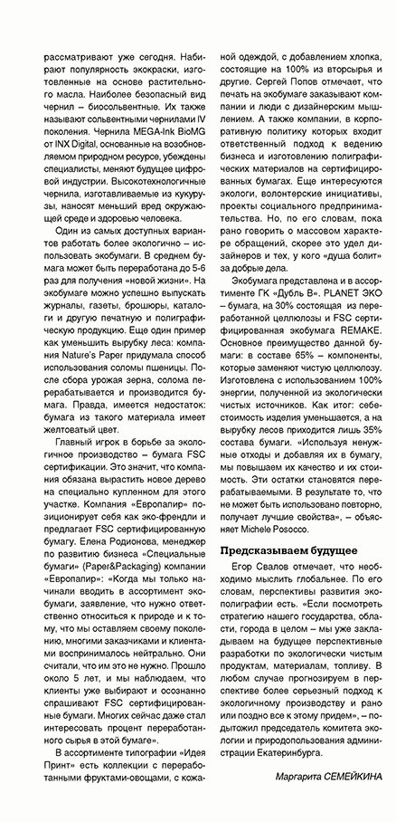 Егор Свалов отмечает, что необходимо мыслить глобальнее. По его словам, перспективы развития экополиграфии есть. «Если посмотреть стратегию нашего государства, области, города в целом – мы уже закладываем на будущее перспективные разработки по экологически чистым продуктам, материалам, топливу. В любом случае прогнозируем в перспективе более серьезный подход к экологичному производству и рано или поздно все к этому придем», – подытожил председатель комитета экологии и природопользования администрации Екатеринбурга.